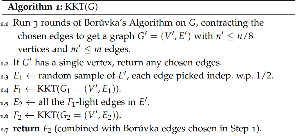 A randomized algorithm for finding the Minimum Spanning Tree in O(m+n) expected time. Created by Karger, Klein, Tarjan.
